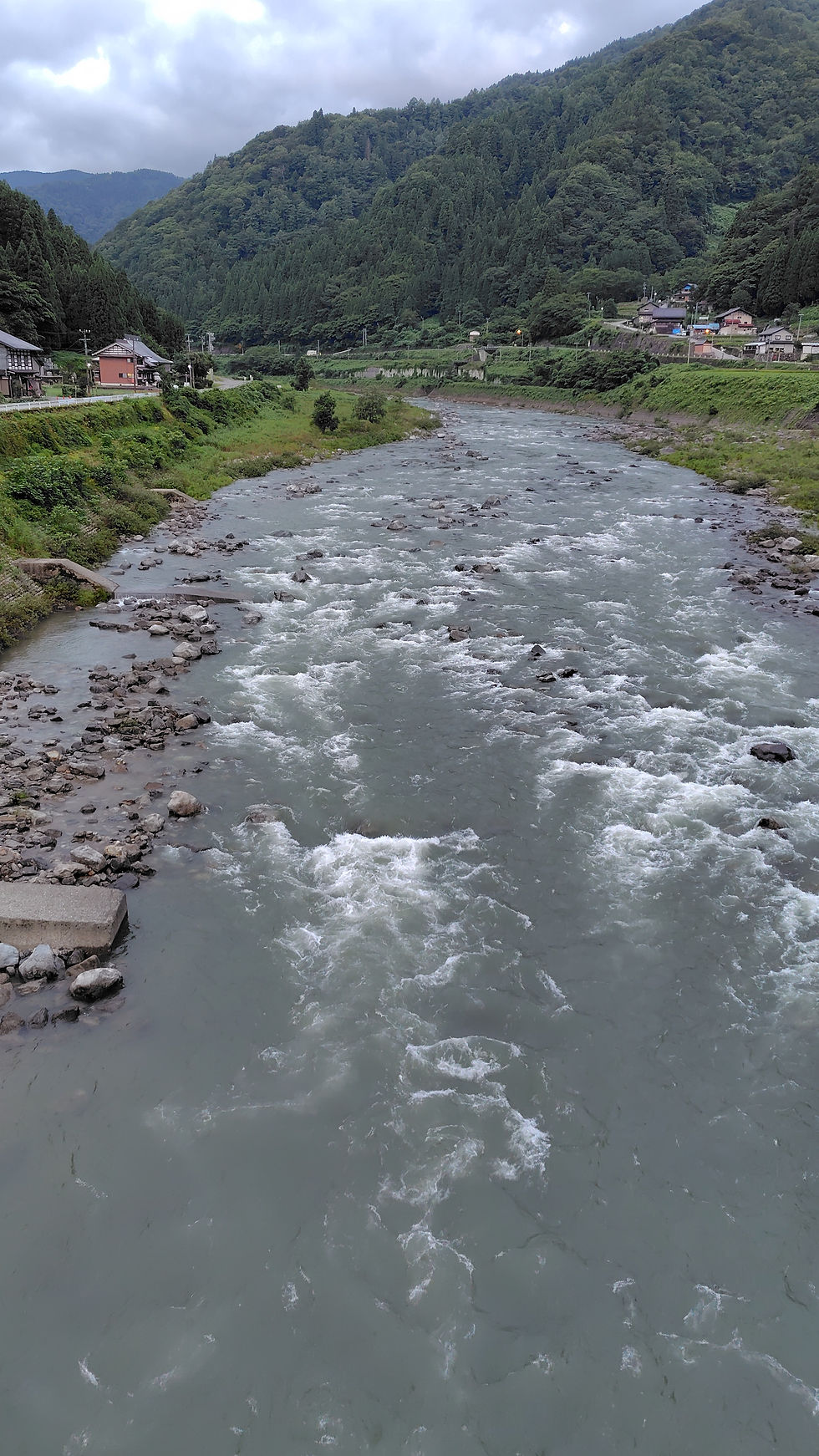 おはようございます。午前5時現在、打保ダムからの放流量は毎秒40tです。上流河川(古川地域)の水量が思ったほど下がりません。濁りもあり友釣りは出来ません。天気予報は曇り時々晴れの予報です。新旭橋上流の水面写真新旭橋下流の水面写真(拡大して見て下さい。濁りの様子が分かります。)