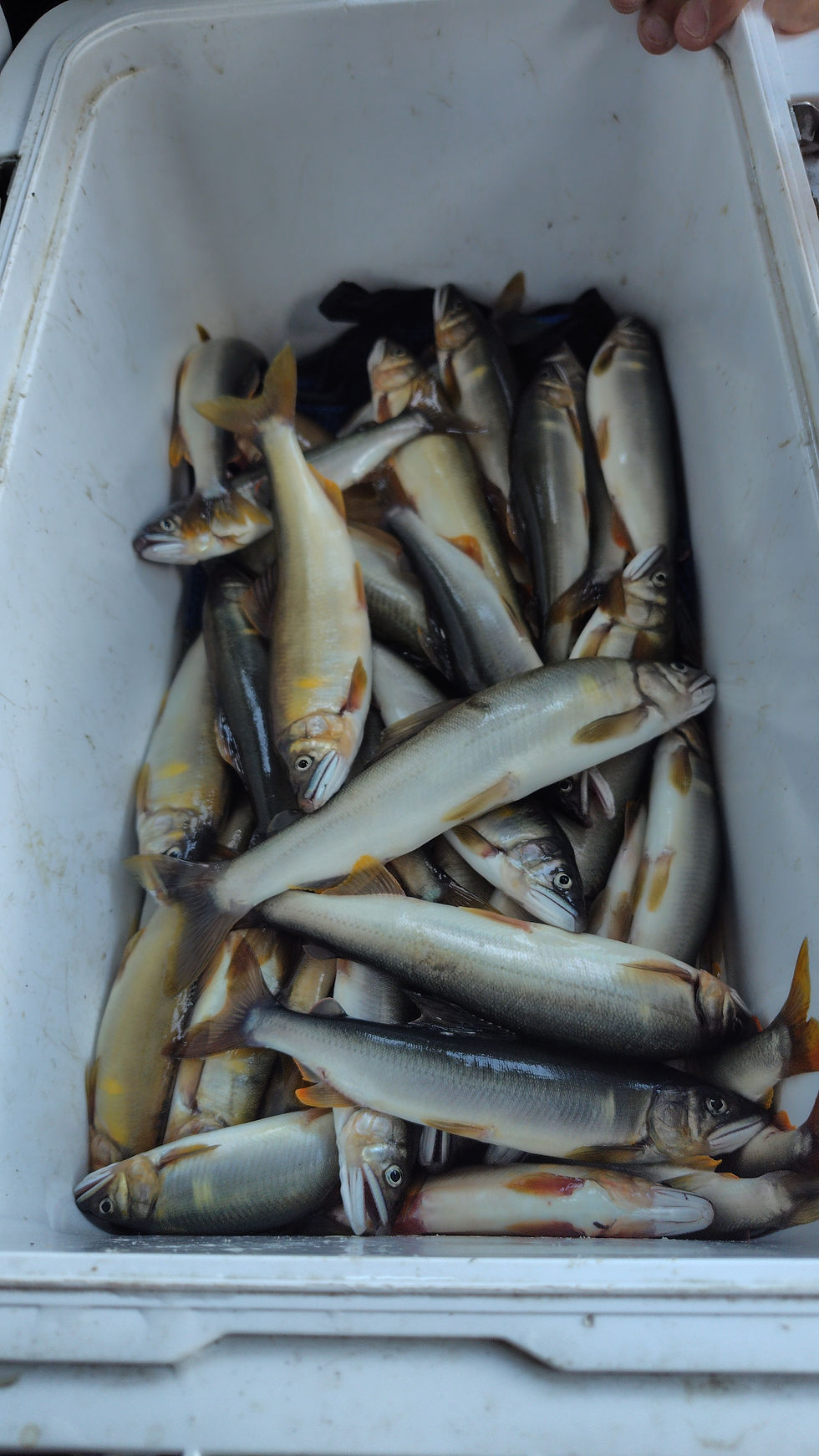 今日も全体的には釣れていました。鮎も大きくなっています。写真を参考にして下さい。「なたべら鮎」です。午後10時現在、打保ダムからの放水量は5tです。友釣りの条件的には最高だと思います。↓ 岡崎市のKさんの釣果です。「なたべら鮎」です。岐阜の釣り人の釣果です。釣れた数は?です。↓
